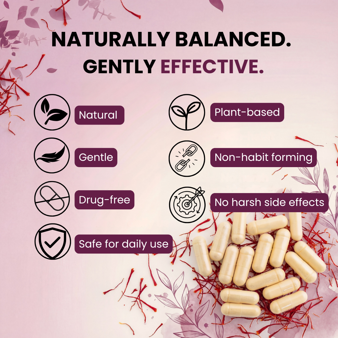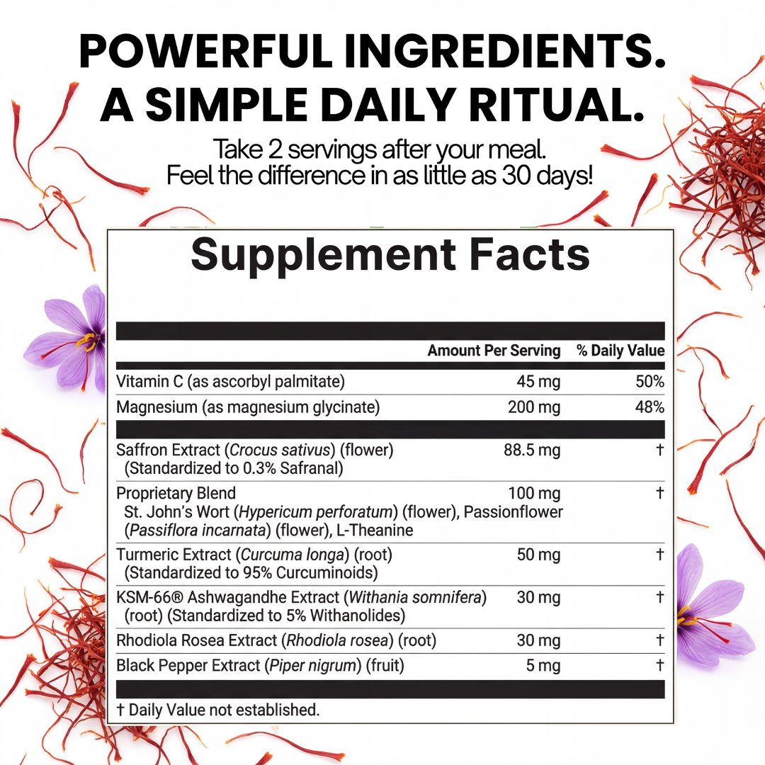 Standardized saffron extract rich in safranal — the compound most studied for balanced mood support. No guessing. No underdosing.