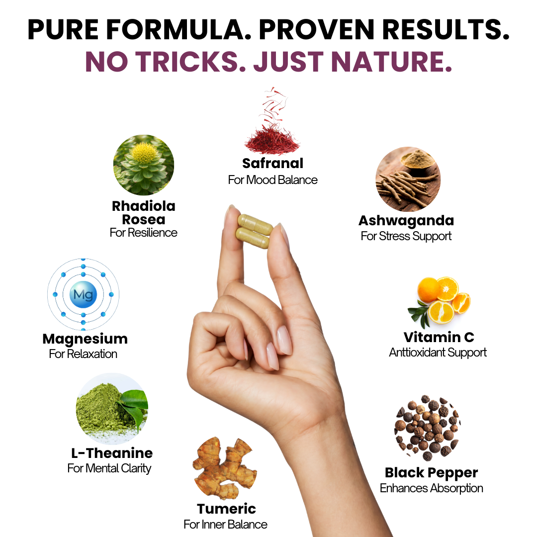 Daily stress and constant mental load can quietly pull you out of balance — until everything feels harder than it should. This gentle, plant-based formula supports a calmer mood, emotional steadiness, and a quieter mind, without changing who you are.